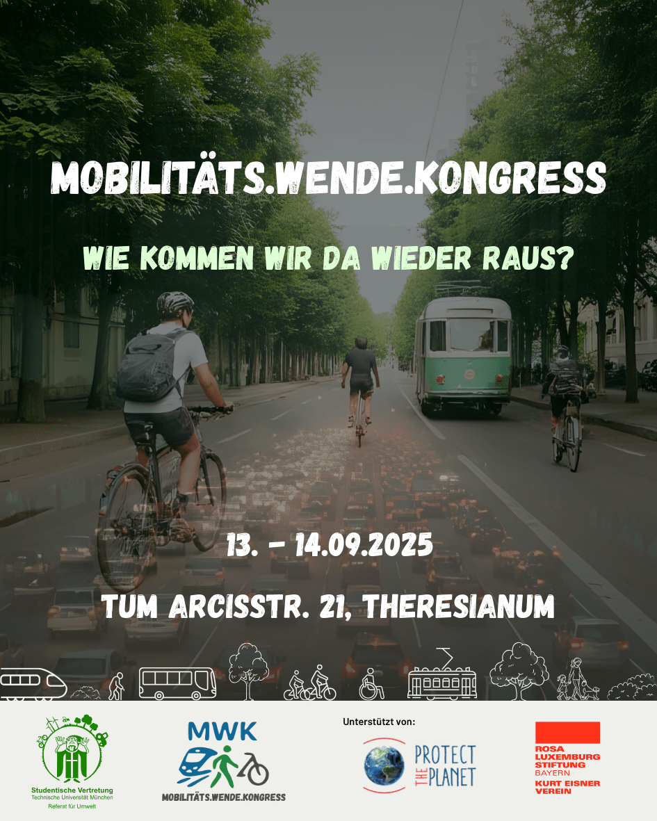 Mit diesen Fragen beschäftigt sich der Mobilitäts.Wende.Kongress an der Technischen Universität München. Mit verschiedenen Vorträgen, Filmen, Podiumsdiskussionen und einem Kulturdialog spannen wir einen Bogen von der Kritik zum Aktivwerden. Komm in den Austausch mit unterschiedlichen Klimainitiativen und Künstler*innen oder schnappe einfach nur neue Informationen auf! Wir wollen uns von positiven Beispielen inspirieren und zum eigenen Handeln anregen lassen.